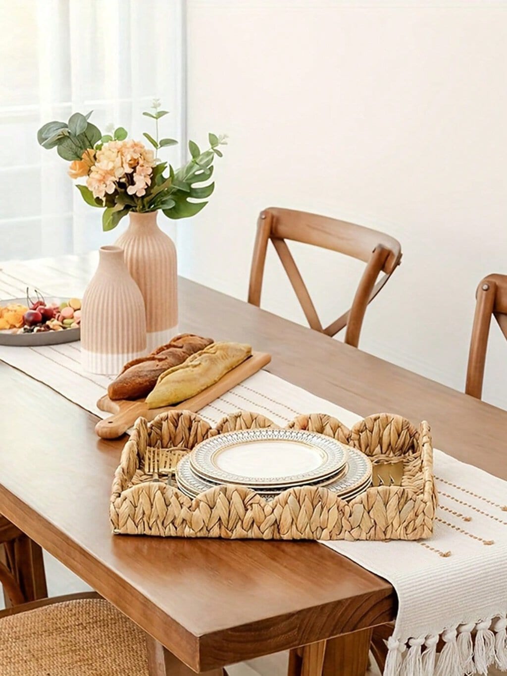 Esta encantadora bandeja de almacenamiento tejida a mano en jacinto de agua es ideal para añadir un toque natural y elegante a tu hogar. Su diseño rectangular con borde festoneado le da un estilo sofisticado que se adapta perfectamente a cualquier ambiente, desde decoraciones boho hasta modernas y rústicas. Perfecta para organizar y presentar objetos en mesas de centro, estanterías o muebles, esta bandeja es tanto funcional como decorativa.