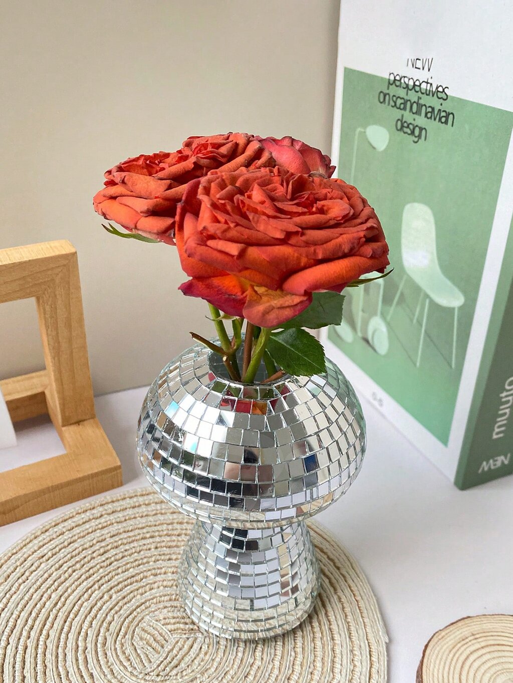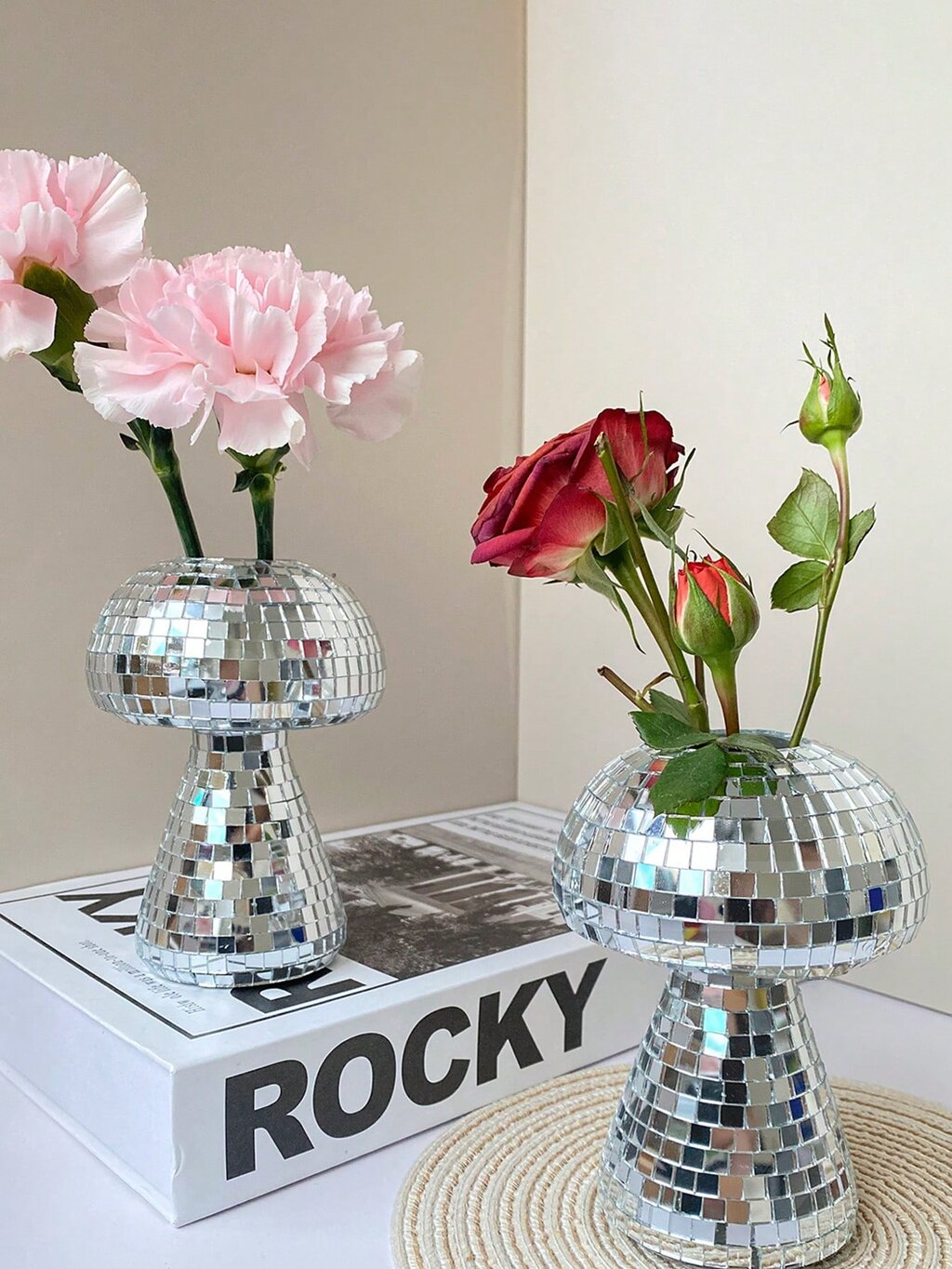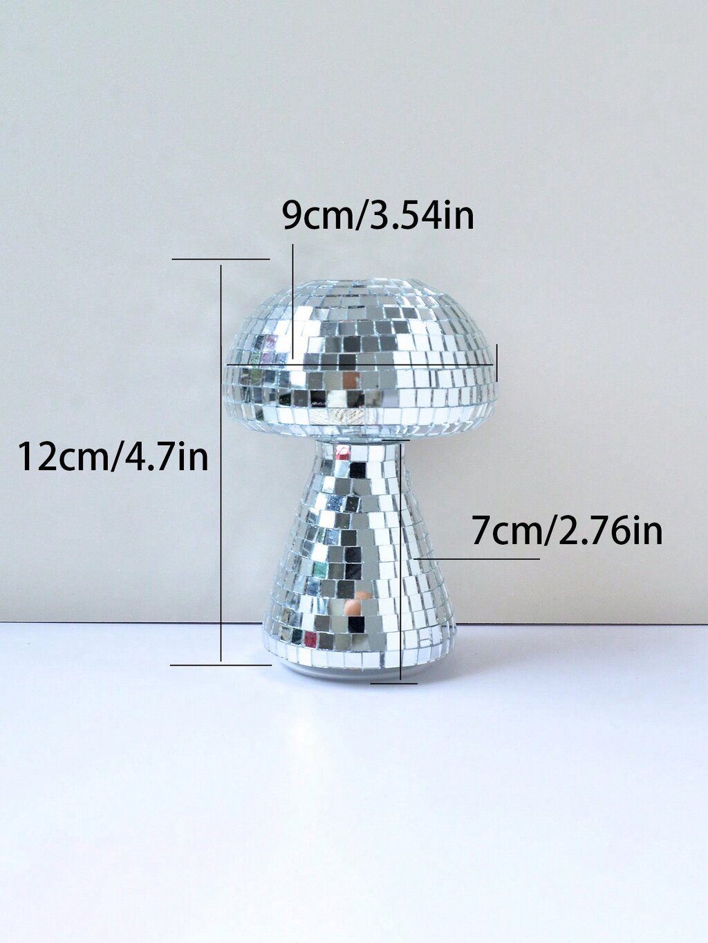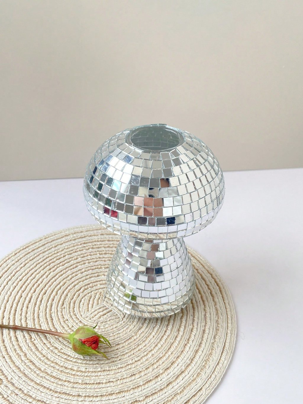 Diseño: Florero en forma de hongo con superficie espejada estilo disco.