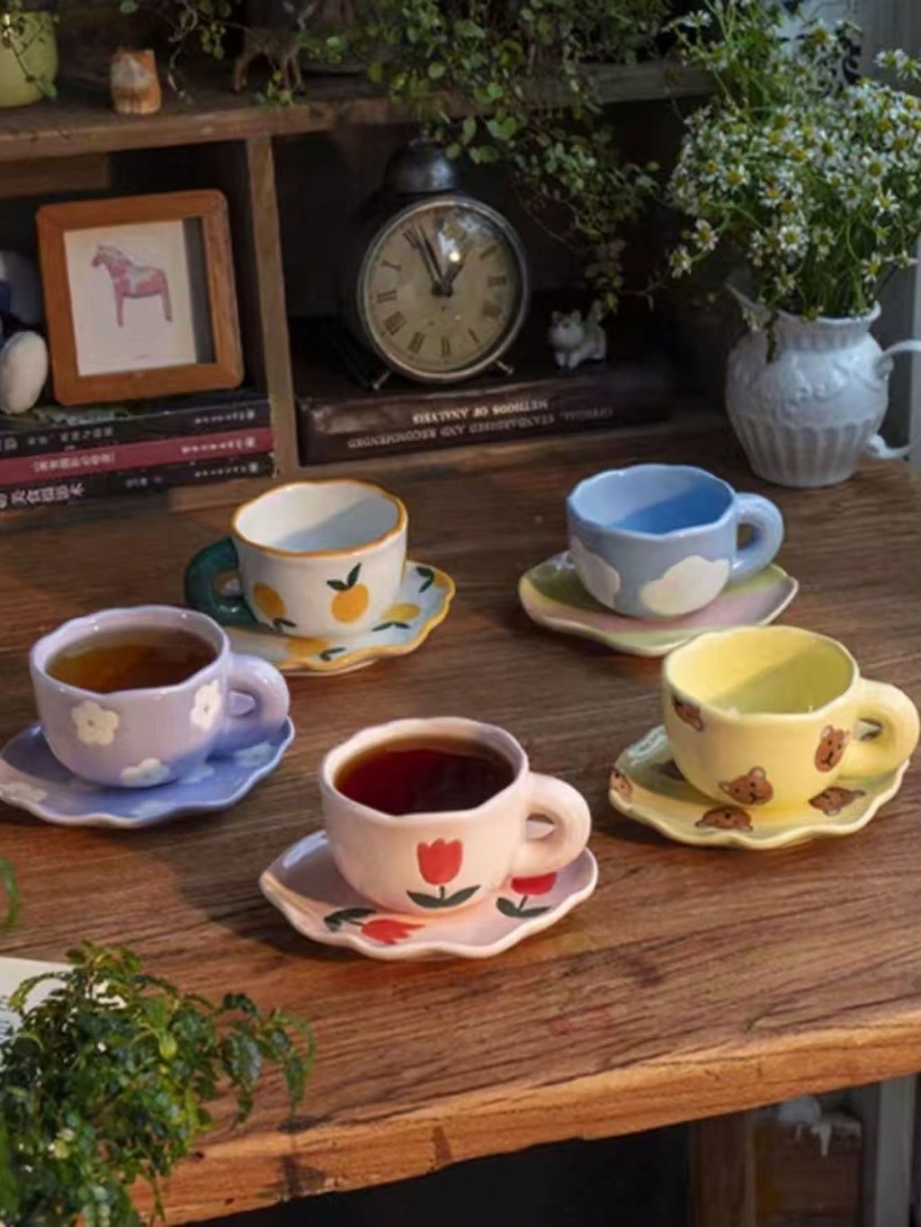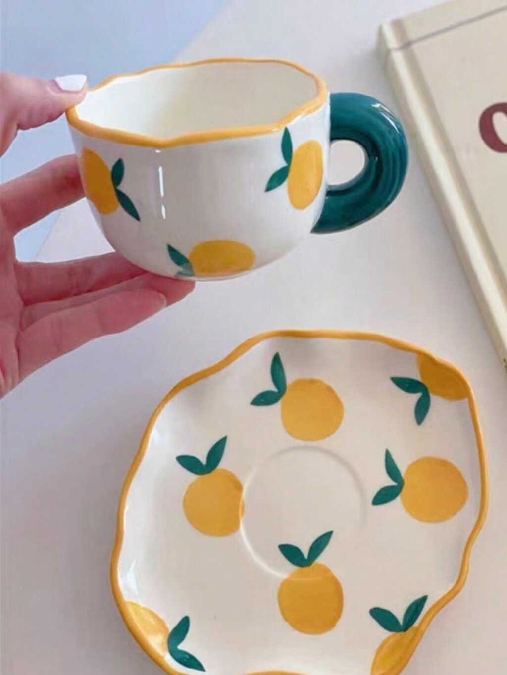 Diseño: Taza con detalles pintados a mano en color naranja brillante, acompañada de un platillo a juego.