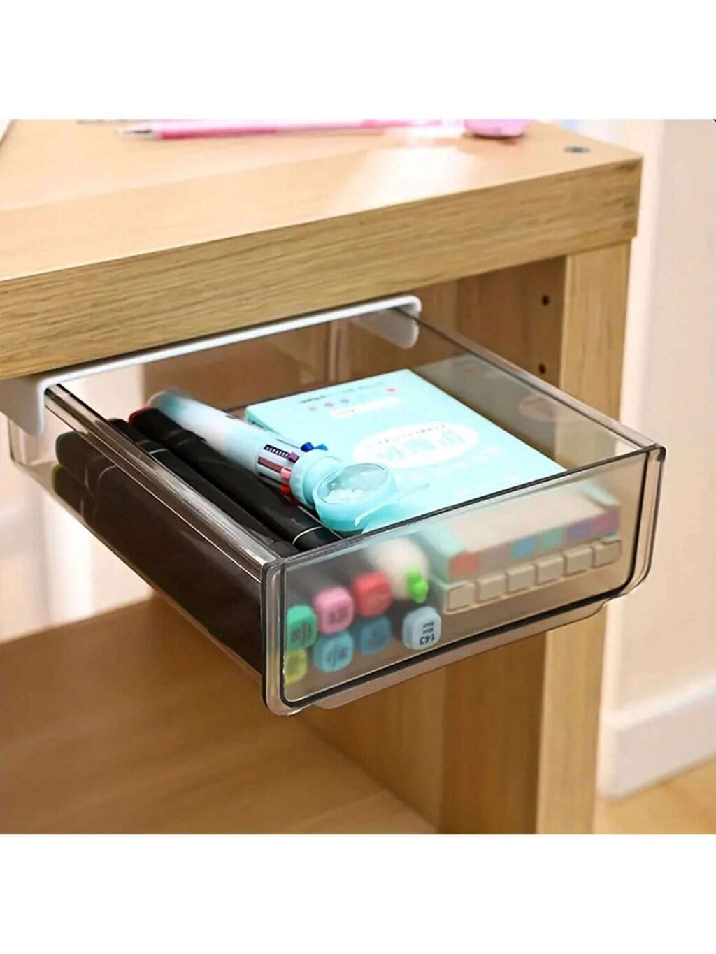 Descripción: El organizador de cajón de almacenamiento bajo escritorio es la solución perfecta para aquellos que buscan mantener su espacio de trabajo ordenado y eficiente. Su diseño oculto permite aprovechar el espacio bajo el escritorio, liberando la superficie de trabajo para otras actividades. Ideal para guardar suministros de oficina, artículos de papelería y otros pequeños objetos, este cajón proporciona una solución de almacenamiento discreta y práctica.