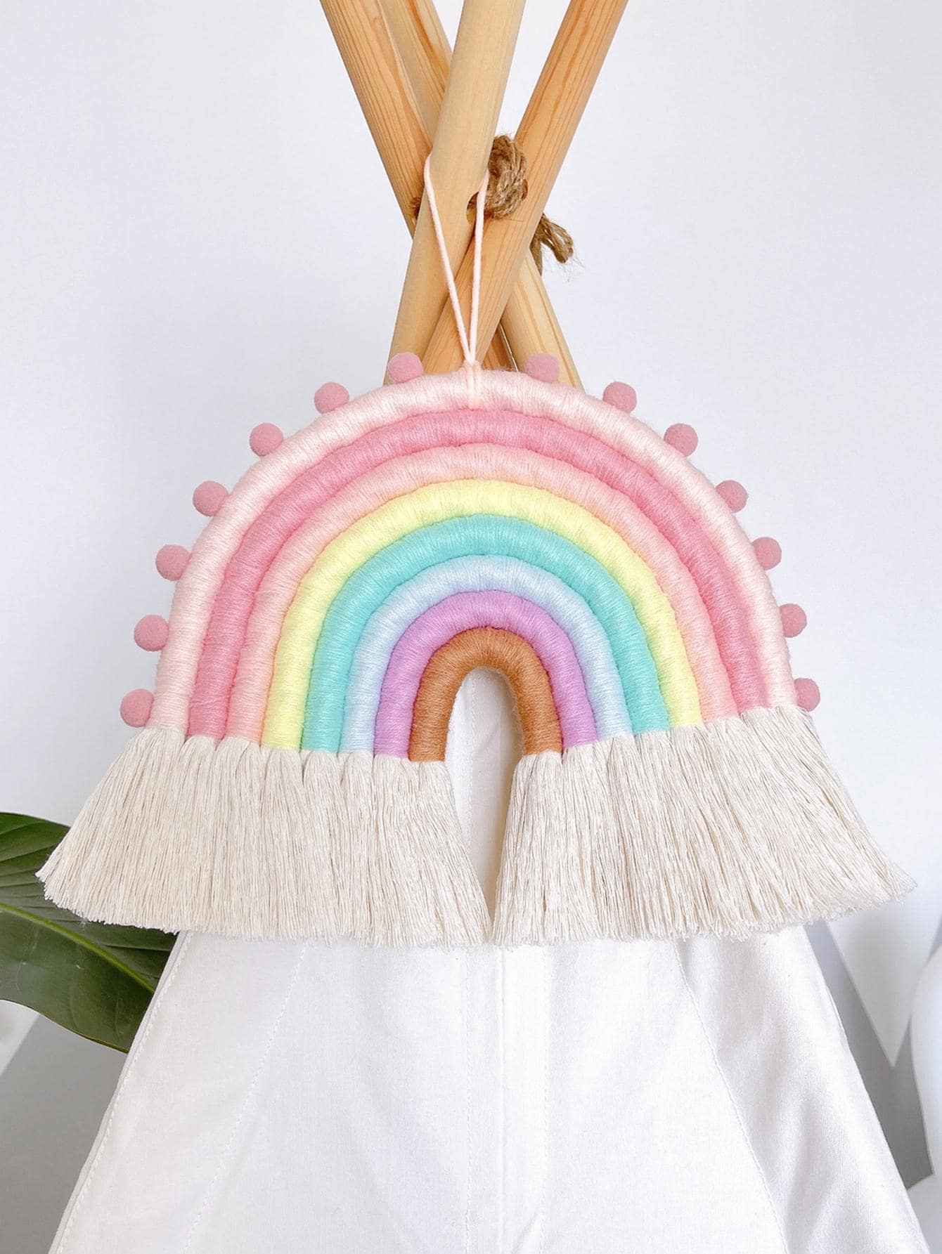 Añade un toque vibrante y divertido a tu espacio con la decoración colgante de pompones arcoíris. Este atractivo adorno presenta una combinación moderna de bloques de color y borlas que transformará cualquier pared en un festín visual, perfecto para salas de juegos, dormitorios infantiles o cualquier rincón que necesite un poco de alegría.